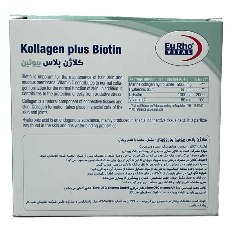 • هر جعبه از کلاژن پلاس بیوتین یوروویتال دارای 14 ساشه 6.4 گرمی می‌باشد.