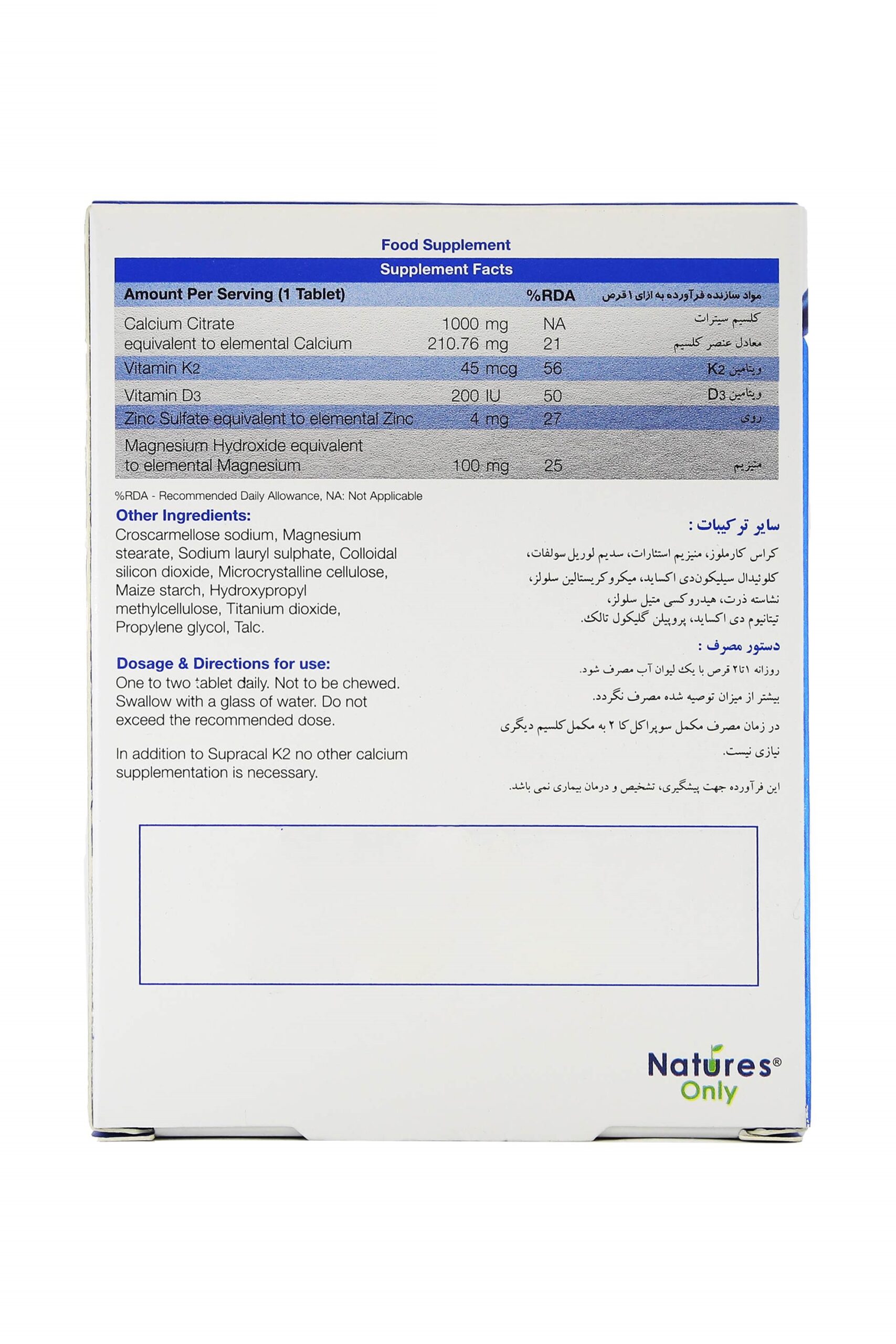 • supracal k2، فاقد گلوتن، سویا، گندم، نگهدارنده، رنگ و طعم دهنده های مصنوعی