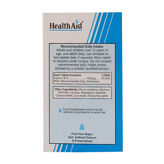 قرص ویتامین B12 ۱۰۰۰ میکروگرم هلث اید مکمل ساخت کشور انگلستان و  جهت درمان کمبود ویتامین مهمی مانند ویتامین ب12 است. ویتامین B12 بزرگ‌ترین و پیچیده‌ترین ساختار را در بین ویتامین‌ها دارد. این ویتامین به‌صورت طبیعی در محصولات گوشتی یافت می‌شود و تنها تولید صنعتی آن از طریق سنتز تخمیر باکتریایی انجام می‌شود. ویتامین ب۱۲ یا کوبالامین یک ویتامین حساس و مهم برای بدن است. این ویتامین برای تکثیر سلولی (خون‌سازی) و عملکرد سیستم عصبی ضروری است. این ویتامین بسیار حساس بوده و قابلیت تحمل نور، حرارت و مواد اسیدی و قلیایی را ندارد. باکتری‌های تولیدکننده ب۱۲ در دستگاه گوارش انسان، از دهان و لثه و حلق تا روده بزرگ، زندگی می‌کنند.