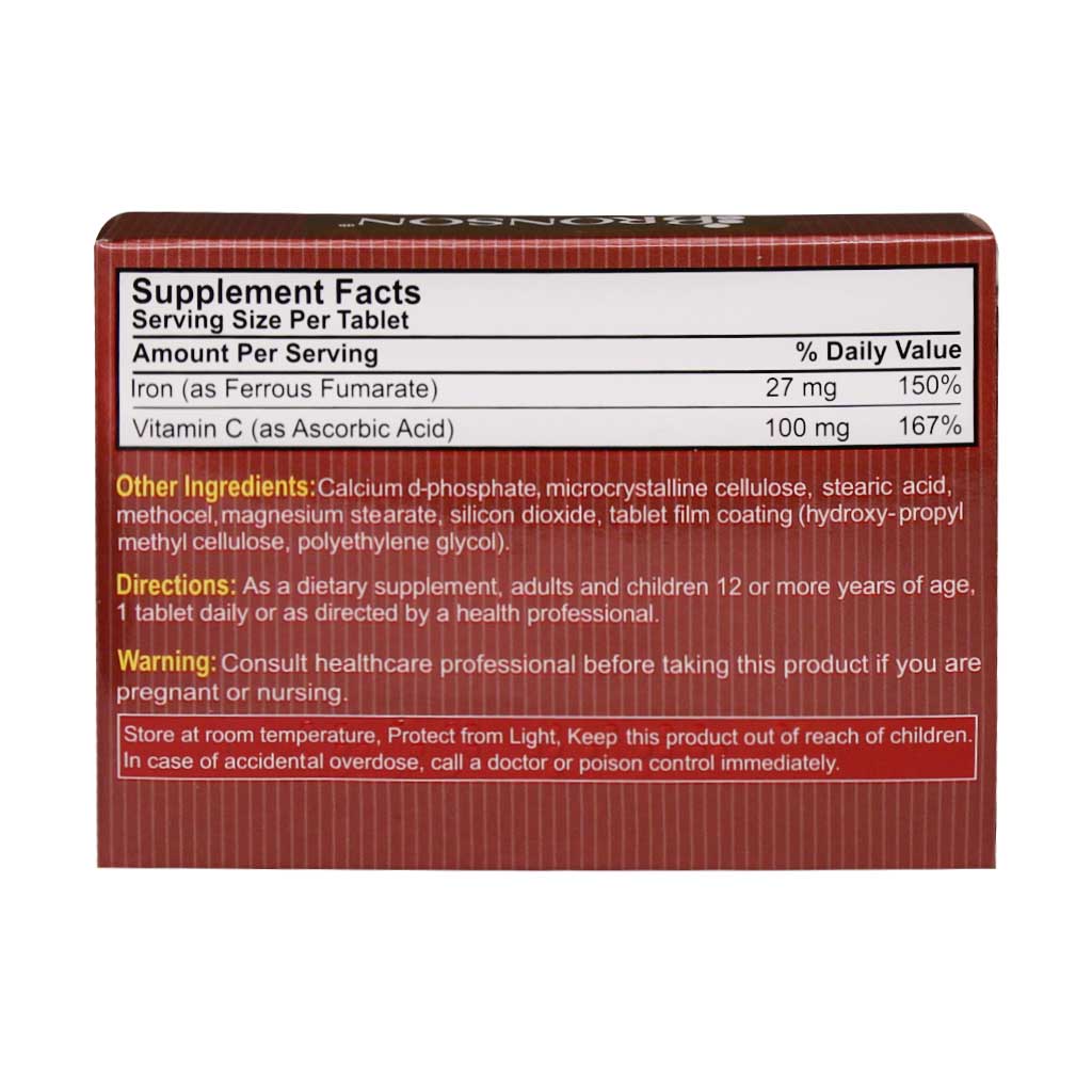 قرص آهن و ویتامین سی حاوی 27 میلی‌گرم آهن به فرم فروس فومارات است. این مقدار از آهن تامین‌کننده نیاز روزانه بدن به‌ویژه زنان و دختران بالای 12 سال است. آهن کافی برای اکسیژن‌رسانی به بافت‌های بدن و عملکرد صحیح آن‌ها لازم است. iron with c در جلوگیری از ابتلا به کمبود آهن موثر است. کمبود آهن می‌تواند منجر به خستگی، ضعف، رنگ‌پریدگی، تنگی نفس، سردرد، سرگیجه، ریزش مو و بی‌اشتهایی شود. همچنین در صورت ادامه یافتن مواجه بدن با کمبود آهن، احتمال ابتلا به کم‌خونی فقر آهن افزایش می‌یابد. زنان و دختران پس از دوره بلوغ، به علت از دست دادن مقادیر زیادی خون در دوران قاعدگی، به شدت در معرض خطر کمبود آهن قرار دارند. لذا مصرف منابع غذایی حاوی آهن و مکمل آهن همچون قرص آهن برونسون به تامین آهن مورد نیاز بدن کمک می‌کند.