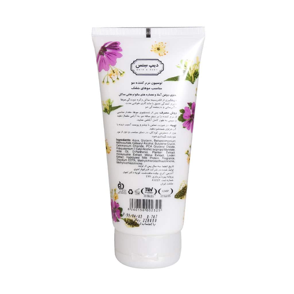 برند دیپ سنس یک برند ایرانی است که محصولات مراقبت از پوست و مو را با فرمولاسیون تخصصی و ترکیبات طبیعی تولید میکند. لوسیون نرمکننده موی خشک دیپ سنس نیز از تولیدات همین برند است که مطابق با استانداردهای روز دنیا طراحی شده است. این محصول در ایران تولید میشود و مناسب مراقبت از موهای خشک، وز و آسیبدیده است.