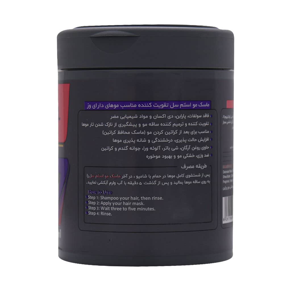 ماسک مو تقویت کننده استم سل برای انواع مو به خصوص موهای دارای وز قابل استفاده است. این محصول در ترکیبات خود حاوی روغن آرگان، شی باتر، آلوئه ورا، جوانه گندم و کراتین است و موجب تقویت موهای ضعیف شده می‌شود. فاقد سولفات، پارابن، دی اکسان و مواد شیمیایی مضر نیز از دیگر ویژگی‌های منحصر به فرد ماسک مو استم سل است. این ماسک مو برای بعد از کراتینه کردن موها مناسب بوده و می‌تواند محافظ کراتین باشد. همچنین با خاصیت ضد وزی، ترمیم کنندگی و بهبود موخوره خود جهت پیشگیری از نازک شدن تار مو، ریزش غیر طبیعی و افزایش حالت پذیری موها به شدت توصیه می‌شود.