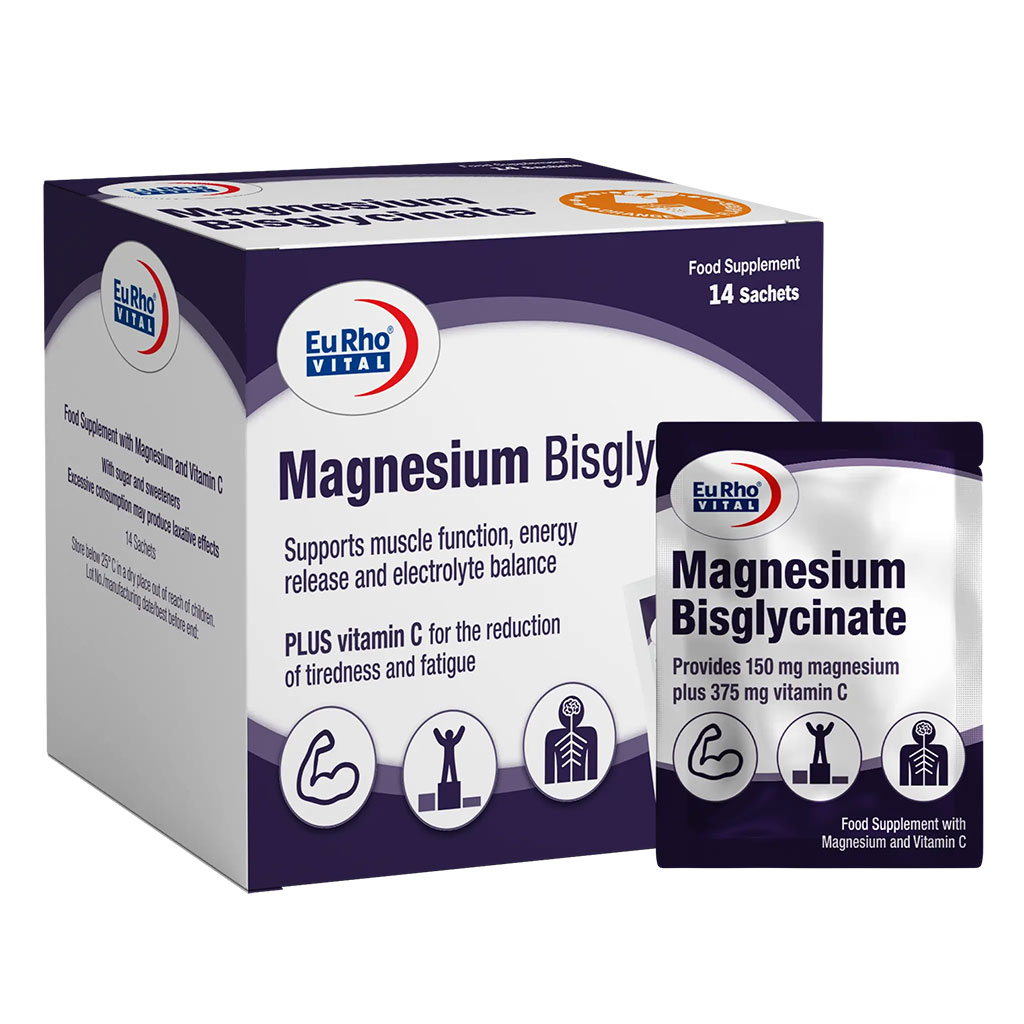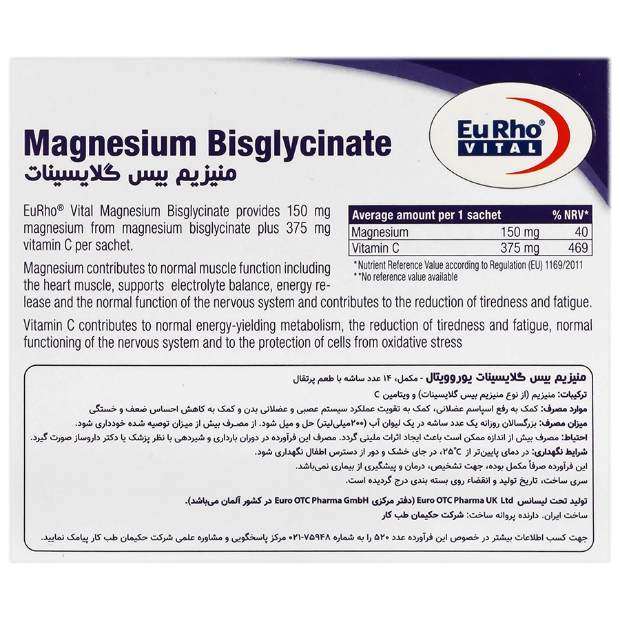 منیزیم بیس گلیسینات یوروویتال یک مکمل تغذیه‌ای حاوی 250 میلی‌گرم منیزیم به فرم منیزیم بیس گلیسینات به ازای هر قرص است که به عملکرد صحیح سیستم عصبی-عضلانی، بهبود اسپاسم عضلات، کاهش احساس ضعف و خستگی عضلانی، حفظ سلامت سیستم قلبی‌عروقی، تولید انرژی، بهبود خلق و خو، بهبود کیفیت خواب، حفظ سلامت و استحکام استخوان‌ها، بهبود سردردهای میگرنی، کاهش علائم سندرم پیش از قاعدگی و … کمک می‌کند. منیزیم بیس گلیسینات یوروویتال به‌شکل قرص در جعبه مقوایی 60 عددی حاوی 4 بلیستر 15 تایی تحت امتیاز و لیسانس شرکت Euro OTC Pharma GmbH کشور آلمان تولید می‌شود. شرکت حکیمان طب کار دارنده پروانه ساخت منیزیم گلیسینات یوروویتال در ایران است.