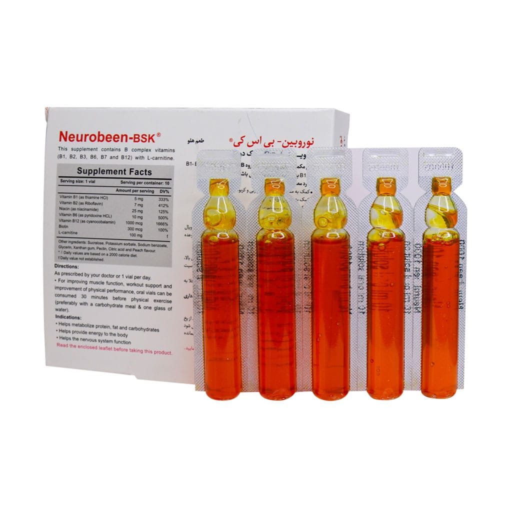 نوروبین، ویال خوراکی تک دوزی حاوی ویتامین های گروه B شامل B1، B2، B3، B6، B7 و B12  به همراه ال کارنیتین است.