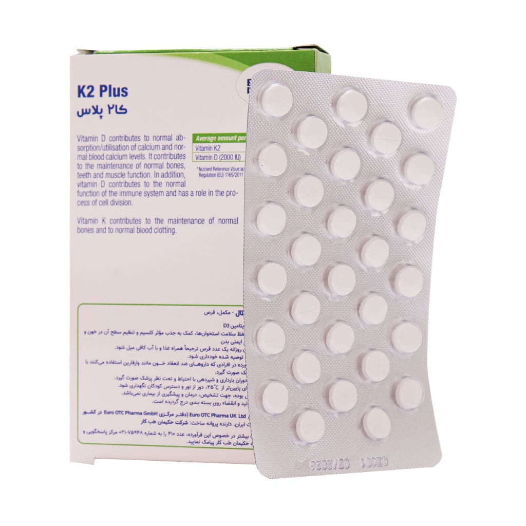 • کا 2 پلاس یوروویتال، حاوی 100 میکروگرم ویتامین K2  و 2000 واحد ویتامین D3 به ازای هر قرص