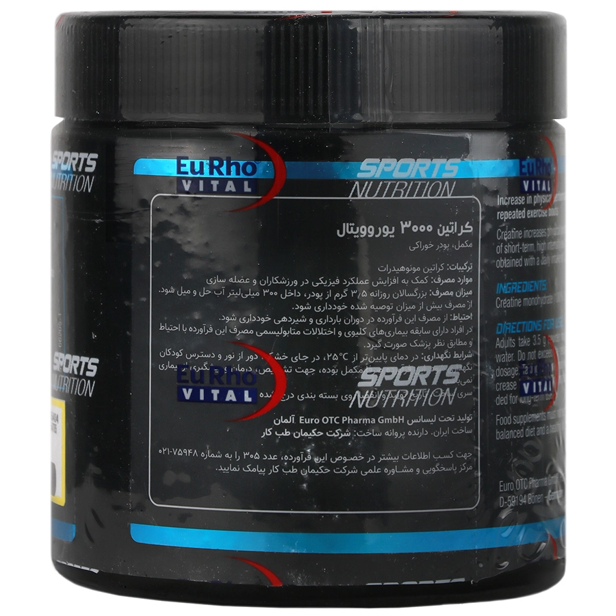 کراتین یوروویتال 3000 مکملی باکیفیت و موثر برای افزایش توان عضلانی و بهبود عملکرد ورزشی است. این مکمل با تامین انرژی مورد نیاز عضلات، قدرت بدنی را افزایش داده و از خستگی زودرس در تمرینات شدید جلوگیری می‌کند. مصرف آن موجب کمک به عضله سازی، بهبود استقامت، افزایش توان انفجاری و تسریع روند ریکاوری پس از تمرین می‌شود.