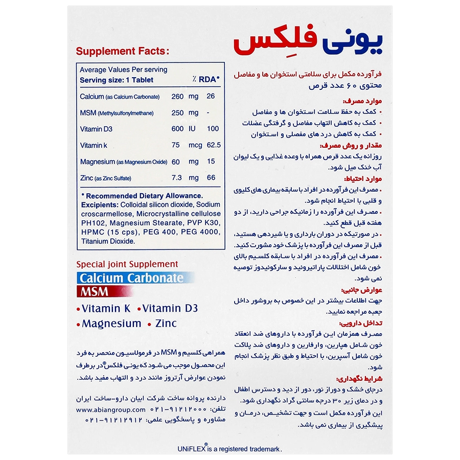 قرص یونی فلکس در بستههای 60 عددی در 4 بلیستر 15 تایی در شکر ابیان دارو ایران تولید و عرضه میشود.